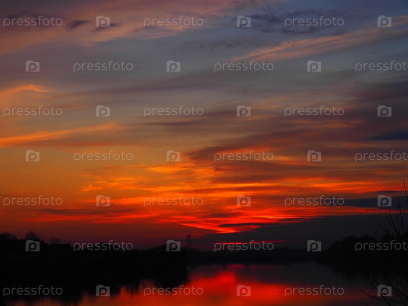 Очень красивый закат над водой. Берег реки и горизонт. Яркие облака нарисованы закатившимся за горизонт вечерним солнцем. Красно-оранжевое голубое драматическое небо и облака. Размытый туманный фокус