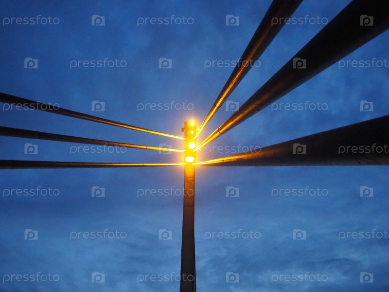 Прожекторы на мосту. Портативная светодиодная вышка. Пешеходный мост Святого Иринея через реку Сава, Сремска-Митровица, Сербия. Вечернее голубое небо с облаками. Металлические столбы и балки, перспектива