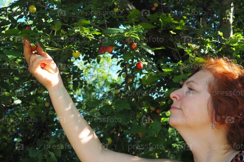 Кавказская женщина 40 лет собирает сливу с дерева. Урожай в Сербии. Prunus cerasifera - это разновидность сливы, известная под общими названиями слива и миробалансовый слив