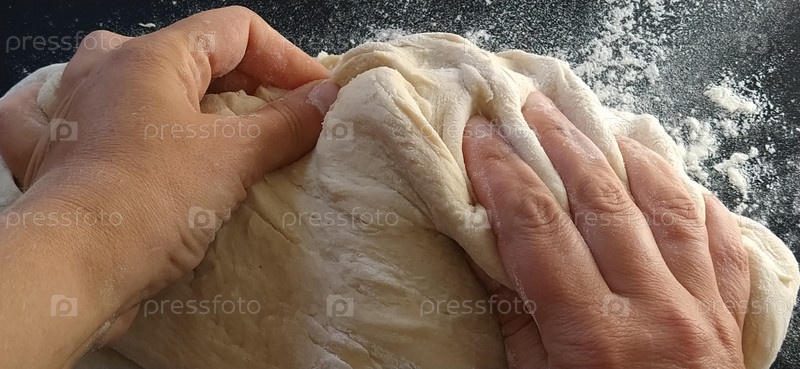 Руки месят тесто. Женщина месила тесто для выпечки или вареников. Подготовка муки, воды и яичной массы к термической обработке. Руки шеф-повара