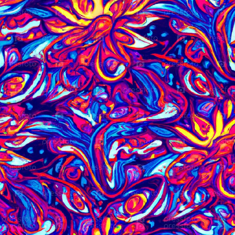 Абстрактный многоцветный цветочный узор. Психоделический фон. Пурпурно-розовые цветы похожи на пионы и астры. Изогнутые разноцветные листья. Розовый, фиолетовый, пурпурный, желтый, синий, пурпурный цвета