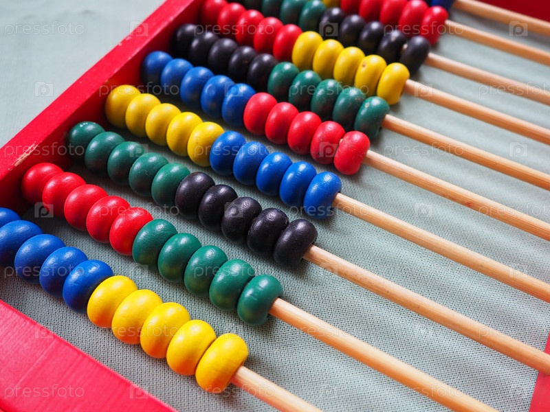 Концепция образования - счеты с множеством разноцветных бусин. Красные, синие, зеленые, черные, желтые детали на счетах. Математические упражнения. Школьная программа