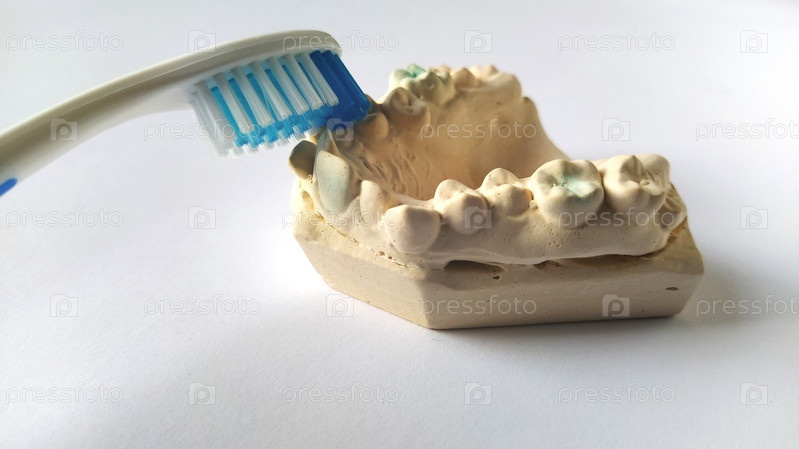 Зубная щетка и макет человеческой челюсти. Гипс нижней челюсти. Концепция стоматологии и здравоохранения. Белый фон. Яркий желтый и синий цвет. Крепкие, кривые зубы. Помощь стоматолога и ортодонта