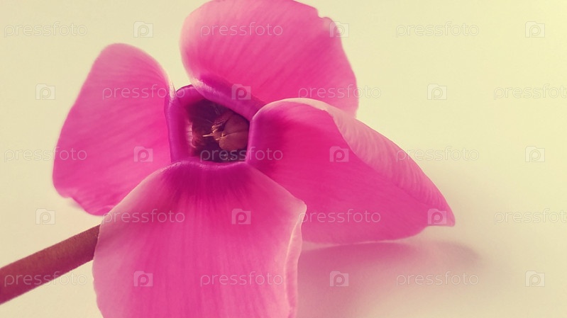 Розовый цветок цикламена на белом фоне. Нежное растение сорвано. Лепестки повернуты назад, коричневый стебель, темная сердцевина у цветка