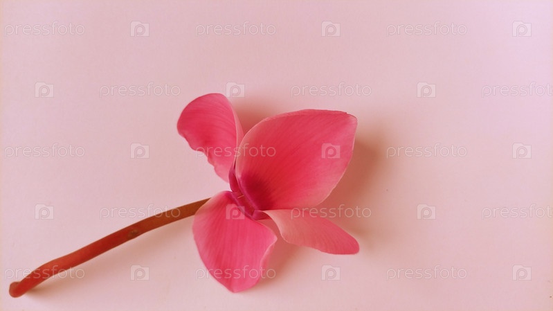Розовый цветок цикламена на теплом розово-красном размытом фоне. Нежное растение сорвано. Лепестки повернуты назад, стебель коричневый, сердцевина у цветка темная. Открытка с копией пространства