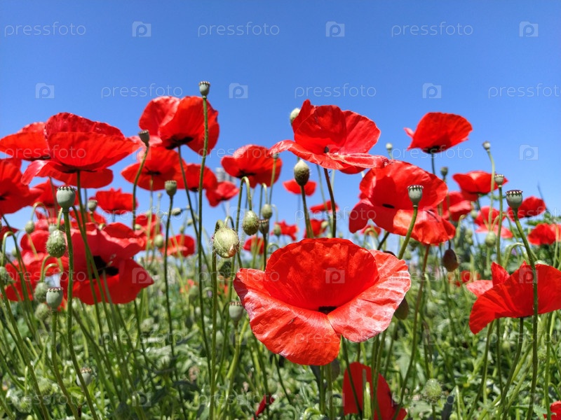 Цветущие красные цветы мака сбоку на фоне голубого неба. Источник опиума. Дикие цветы на поле. Нежные лепестки мака блестят на ярком солнце. Ветер дует цветы