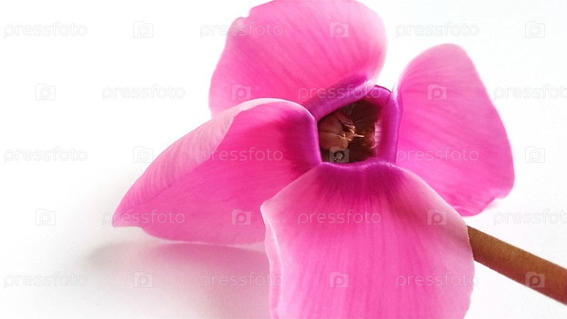Розовый цветок цикламена на белом фоне. Нежное растение сорвано. Лепестки загнуты назад, стебель коричневый, сердцевина у цветка темная