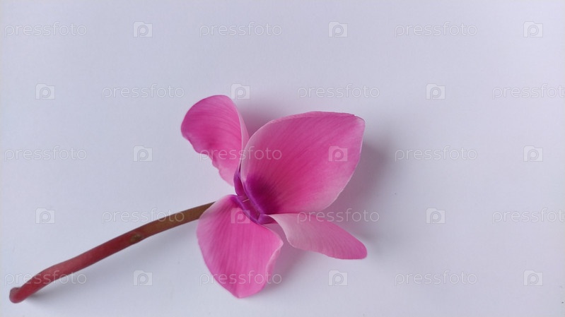 Розовый цветок цикламена на белом фоне. Нежное растение сорвано. Лепестки загнуты назад, стебель коричневый, сердцевина у цветка темная