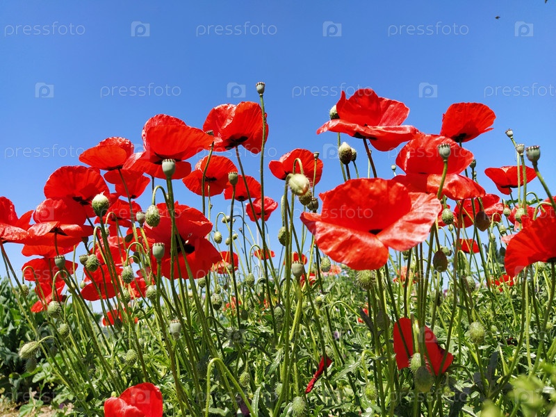 Цветущие ярко-красные маки на поле. Дикие красивые цветы. Голубое небо на заднем плане. Нежные лепестки цветов блестят на солнце. Распускание бутонов мака. Размытое боке