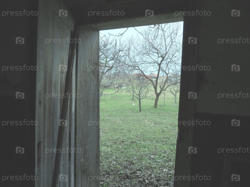 Старая деревянная открытая дверь. Двери кроватки, стойло для скота или гараж. Деревянные балки и дверной проем. Весенняя зелень от дверей. Дверь в неизвестность