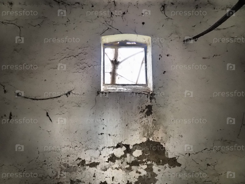 Небольшое окно в верхней части стены. Страшные стены с паутиной. Слуга старой церкви. Хэллоуин или место с привидениями. Тюремная камера с веревками для пыток. Видения и мир галлюцинаций