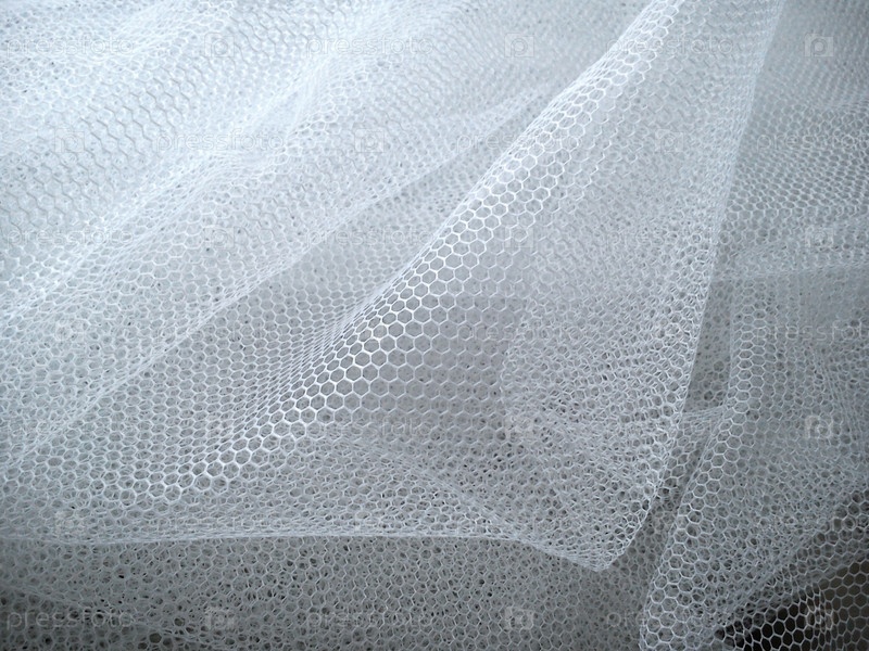 Белая мятая сетчатая ткань. Моющаяся вещь из синтетического материала. Москитная сетка складывается в мягкие складки. Ткань, похожая на фату невесты