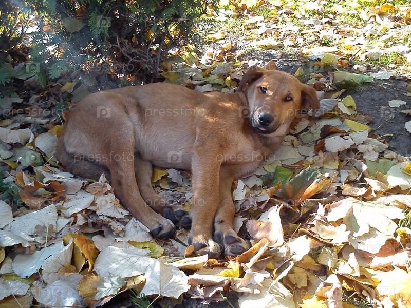 Бездомная рыжая собака лежит на осенних листьях в городском парке. Они разбудили ее. Тревожный взгляд на хорошее лицо. Черный мокрый нос, черные пятки и подушечки лап. Умное, добродушное животное
