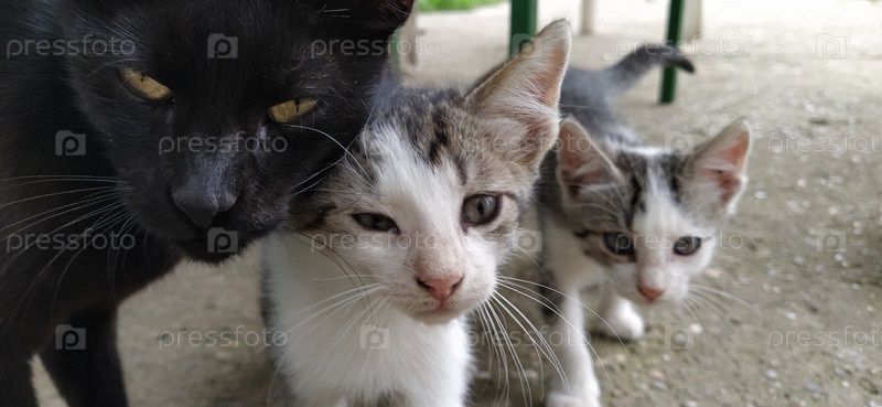 Семья кошек. Черная кошка-мать и два бело-серых полосатых котенка. Животные на улице. Кошка и котята ласкаются и трутся головами друг о друга. У котят большие уши