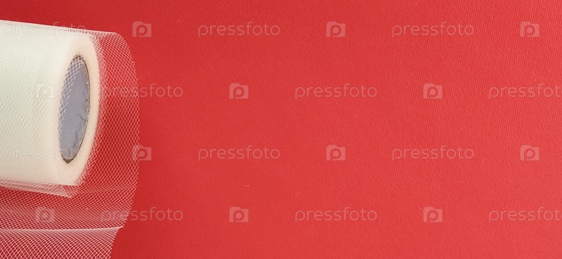 Ткань - белая сетка в рулоне на красном фоне. Нейлоновая лента для завязывания бантиков на волосах. Моток тюлевой ткани. Копировать пространство