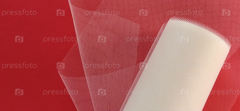 Ткань - белая сетка в рулоне на красном фоне. Нейлоновая лента для завязывания бантиков на волосах. Моток тюлевой ткани. Копировать пространство