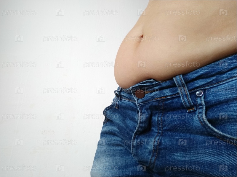 Обвисший живот. Складки кожи и жира по бокам нависают над талией джинсов. Фигура, испорченная перееданием или беременностью. Ожирение и диабет. Белый фон. Целлюлит дряблых мышц