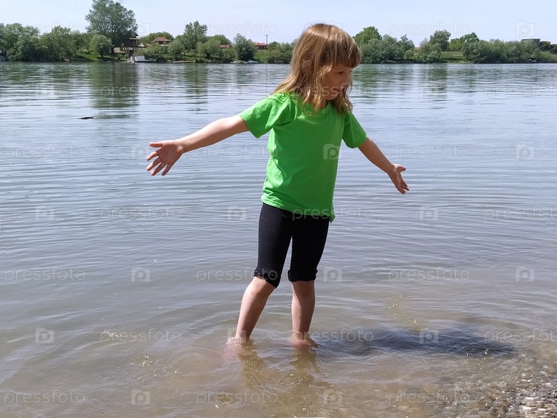 Девочка 6-7 лет играет с водой в реке. Ребенок одет в зеленую футболку и черные шорты. Лето на пруду. Счастливая девушка раскинула руки и смотрит в сторону. Праздники на природе