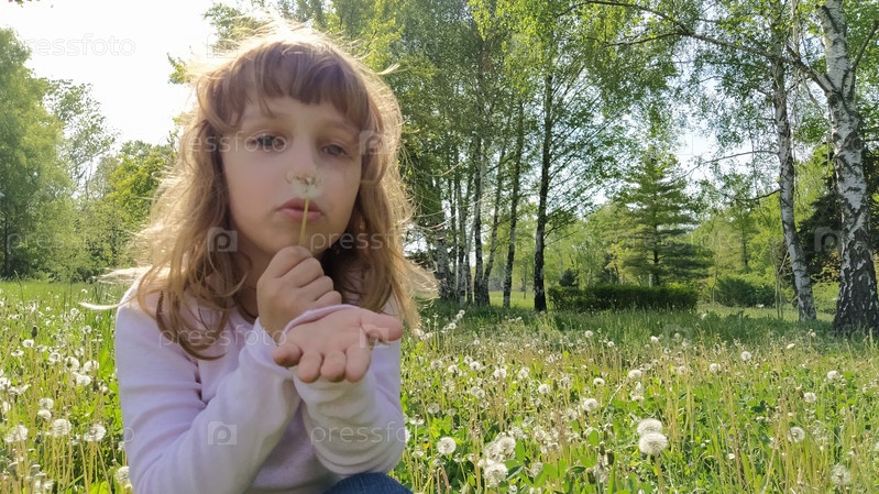 Милая молодая девушка набирает воздух в грудь и сдувает белые пушистые семена одуванчика. Ребенок со светлыми волосами одет в белую блузку. Полевые цветы на лугу. Игры в летнем лесу