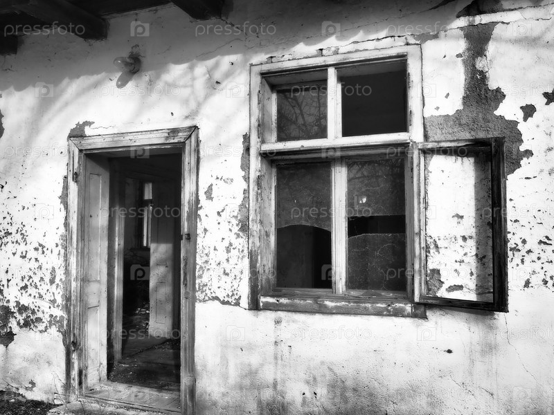 Старый дом с окнами и дверью. Разрушающийся сельский дом. Концепция урбанизации и забвения Родины. Заброшенный дом. Разбитое стекло в окне и падающая штукатурка. Сербия. Балканы