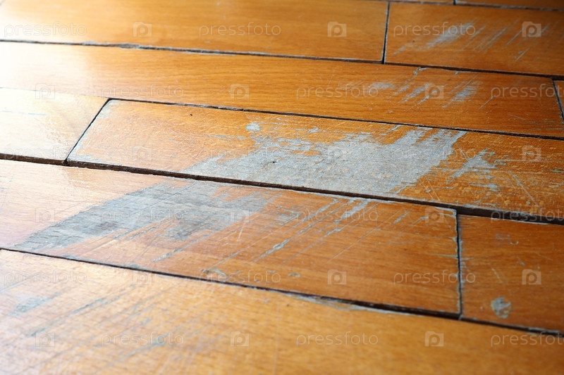 Старый, поцарапанный паркет нуждается в уходе. Паркет поврежден царапинами от длительного использования