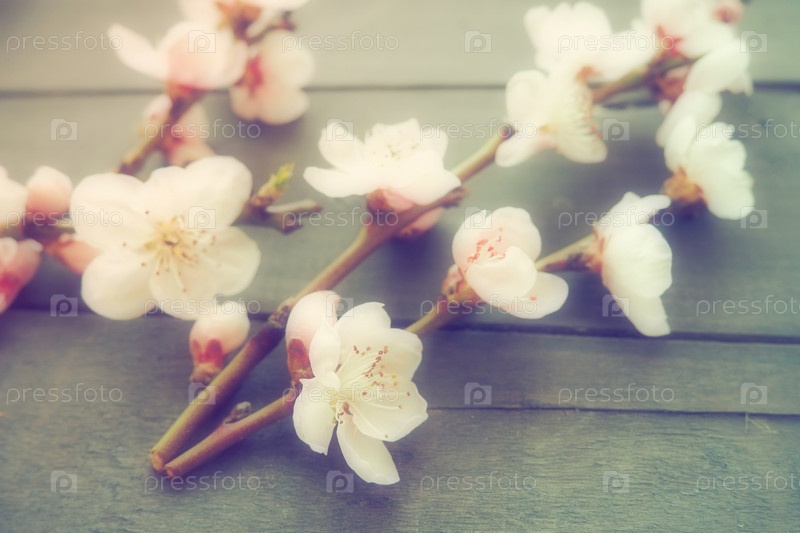 Ветки с розовыми цветами яблони или персикового дерева на черных досках. Нежные соцветия в контровом свете. Мягкий фокус, туманность. Тема весны, праздника, спа, женской красоты, домашнего интерьера