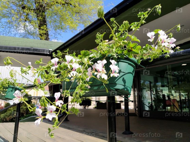 Пеларгония — род растений семейства гераниевых. Белая плющелистная герань с красными прожилками на лепестках. Цветочная коробка. Оформление балконов, окон, фасадов домов, улиц, газонов. Герань