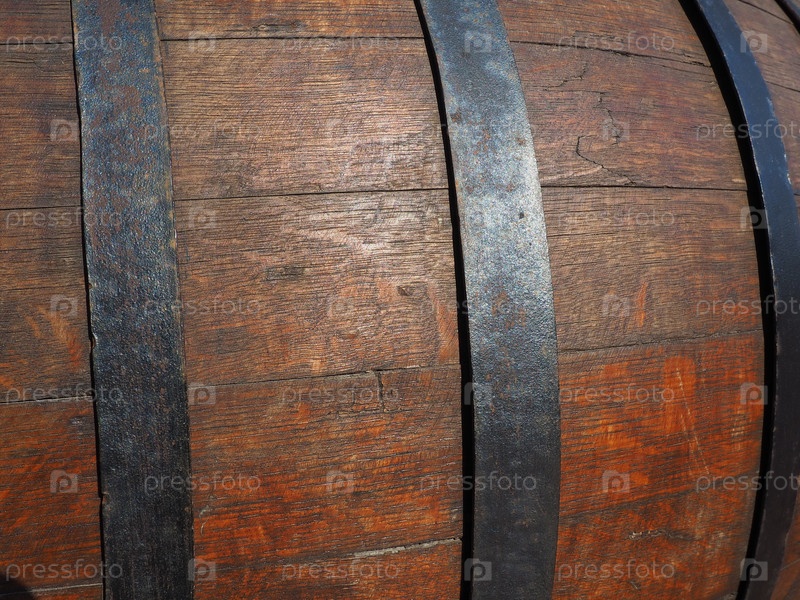 Традиционная старая деревянная бочка с изогнутыми стенками и металлическими обручами. Посуда для созревания алкогольных напитков - медовухи, пива, вина, виски. Перекатываемый цилиндрический сосуд для жидких веществ