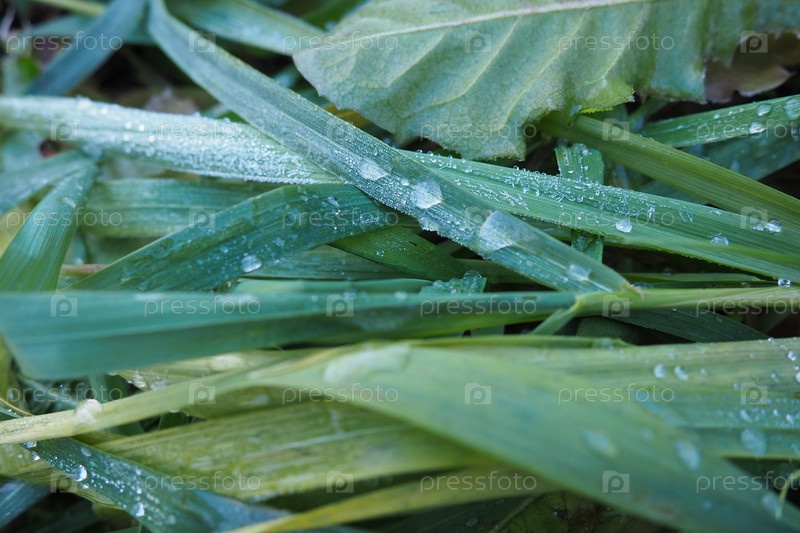 Роса или талая вода на зеленой траве. Оттаивание после утреннего зимнего мороза. Лежащая трава на лугу. Несезонная, безветренная безветренная погода. Зеленый лист с каплями воды