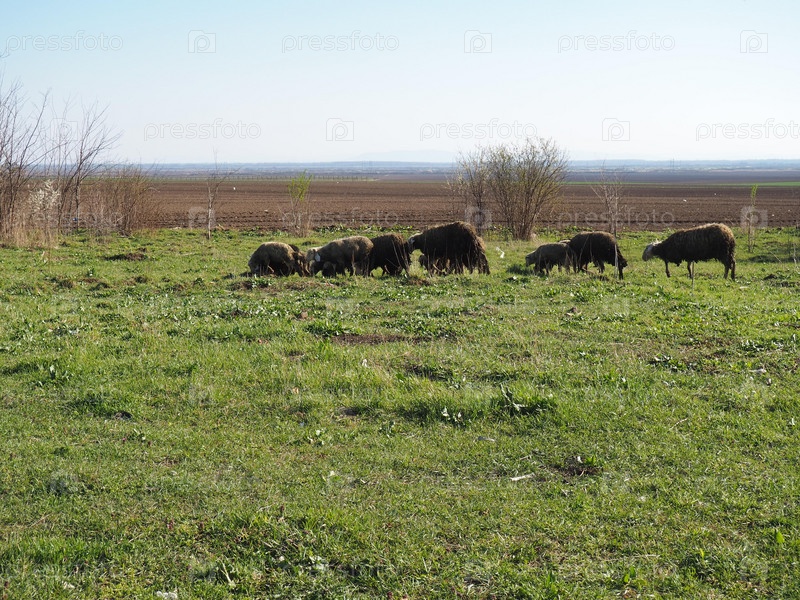Стадо баранов в поле. Жвачные животные пасутся на лугу. Овец и баранов разводят на траву. Земледелие и животноводство в Сербии. Бурая или черная порода овец. Животные для производства шерсти