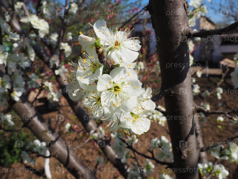 Белые красивые цветы на яблоне. Весеннее цветение в саду. На заднем плане огород или пашня. Сельское хозяйство. Крупный план, лепестки и тычинки на цветке