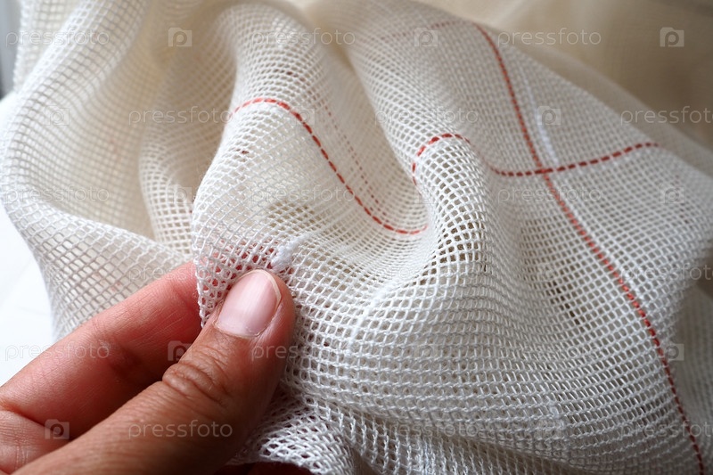 Белые грубые хлопчатобумажные или льняные шторы из переплетений тонких нитей. Женская рука ощупывает ткань. Комната оформления окон. Красная полоса. Ткань сложена мягкими волнами. Интерьер квартиры