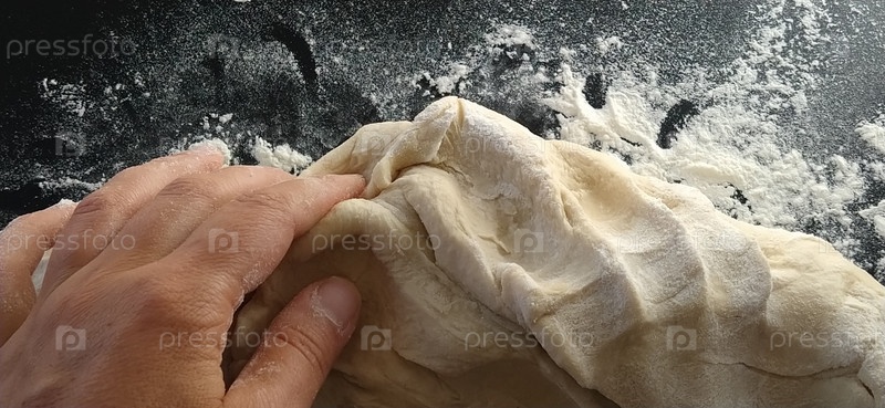 Руки месят тесто. Женщина месила тесто для выпечки или вареников. Подготовка муки, воды и яичной массы к термической обработке. Руки шеф-повара