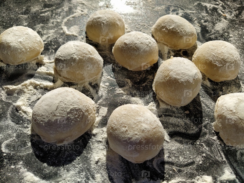 Круглые кусочки песочного теста для приготовления печенья или пряников. Сырые булочки или пельмени с разбросанной мукой на черном фоне