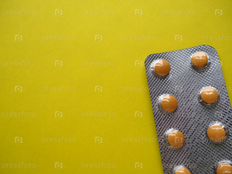 Куча таблеток на желтом фоне. Таблетки, витамины и блистеры с капсулами для лечения заболеваний. Скопируйте пространство