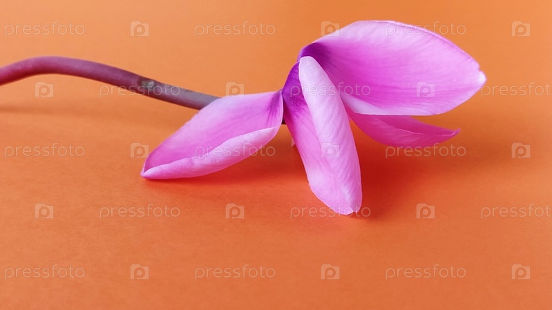Розовый цветок цикламена на ярко-оранжевом фоне. Нежное растение сорвано. Открытка или поздравление с 8 марта или днем матери
