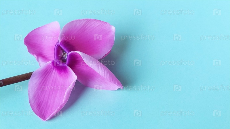Розовый цветок цикламена на синем фоне. Нежное растение сорвано. Открытка или поздравление с 8 марта или днем матери