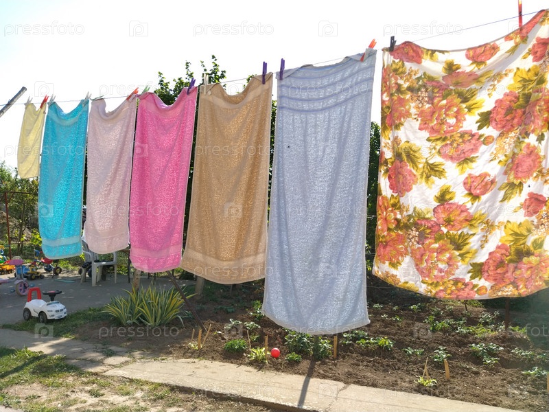 Сремска-Митровица, Сербия, 10 июля 2020 года, полотенца и одежда сохнут на веревке. Домохозяйка волнуется. Влажную ткань вешают на прищепки для дальнейшего высыхания. большая стирка