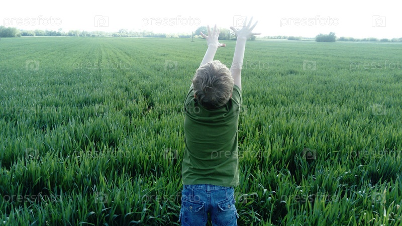 Мальчик бежит по пшеничному полю и протягивает руки к небу. Ребенок одет в джинсовые синие брюки и зеленую футболку. Трава до горизонта. Концепция гармонии с природой