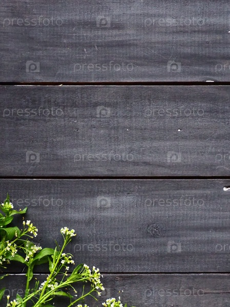 Цветы пастушеского кошелька на деревянном фоне. Копируйте место для текста. Карта для праздника. Деревянный фон. Белая пастырская сумка Capsella bursa-pastoris, растение семейства горчичных Brassicaceae