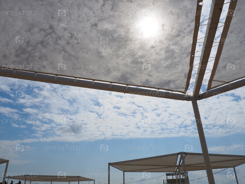 Затеняющий навес из деревянных балок и белой ткани. Наслаждайтесь отдыхом на роскошном пляже в солнечную погоду, защищенном от ультрафиолетовых лучей. Голубое небо, солнце и белые облака. Взгляд вверх из положения лежа