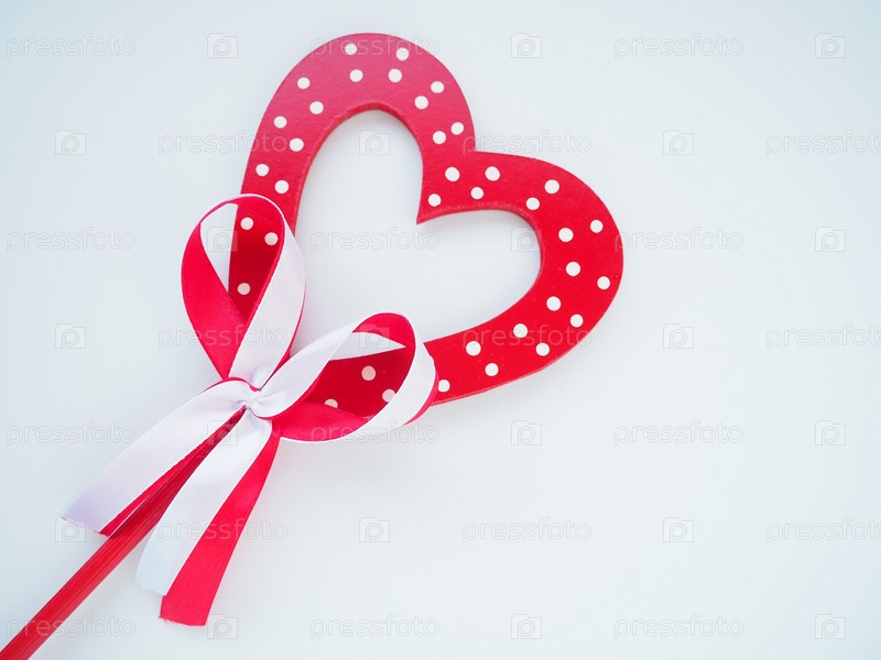 Концепция дня святого Валентина. Красное деревянное сердце с белыми точками и ленточным бантом на палочке. Белый фон. Красивый бант в качестве украшения. Любовь и отношения. Признание или поздравления