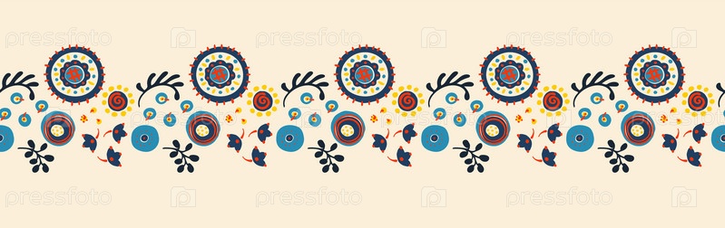 Набор этнических элементов. Бордюр представляет собой полосу с цветами, листьями, ветками, вензелями. Народная вышивка. Славянский, украинский, русский мотив. Хохлома, матрешка, дымковская игрушка. Мексиканский, индийский, цыганский ковер. Вязаное кружево