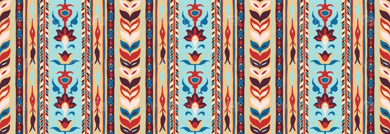 Геометрический дамасский орнамент. Икат границы. Этническая вышивка с листьями и монограммами. Племенная векторная текстура. Бесшовный народный узор в ацтекском стиле. Индийский, скандинавский, цыганский, мексиканский, африканский ковер