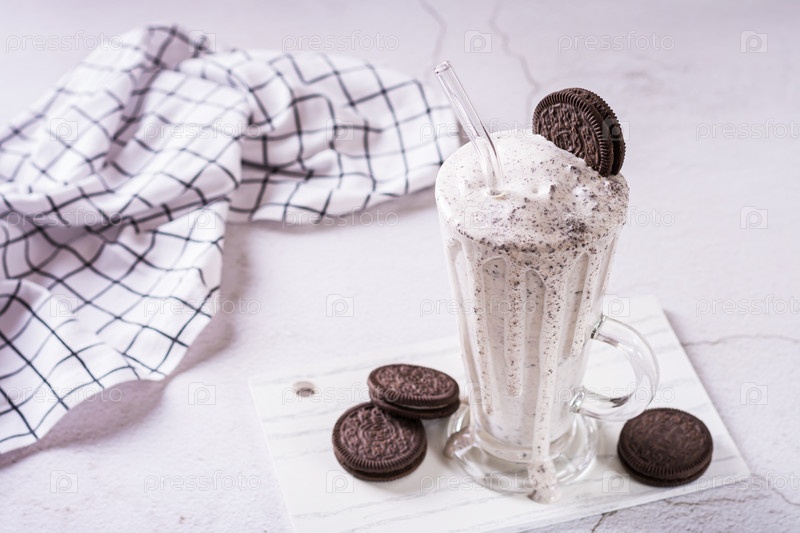 Домашний смузи со сливками и взбитым печеньем с шоколадной крошкой в стакане с соломинкой