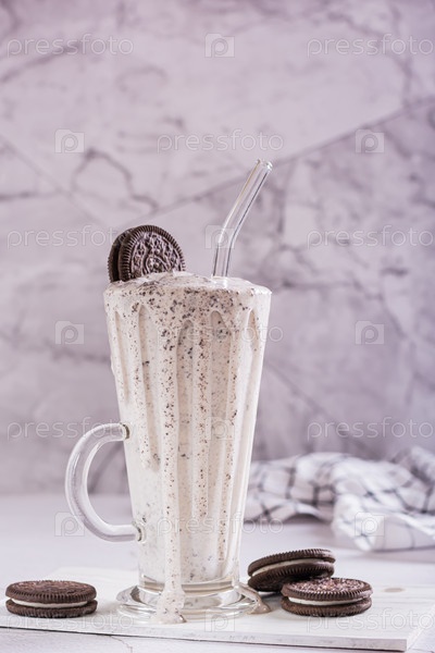 Молочный коктейль из шоколадного печенья орео и мороженого в стакане с соломенным вертикальным видом