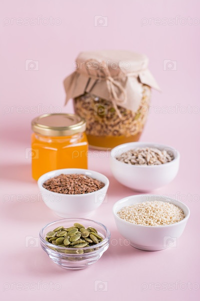 Подсолнечник, лен, кунжут, тыквенные семечки и мед для здоровой иммунной смеси, вертикальный вид