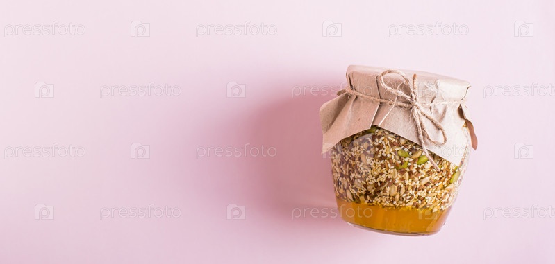 Баночка со льном, кунжутом, тыквой, семечками и медом на розовом фоне вид сверху веб-баннер