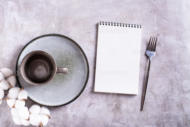 Пустая керамическая кружка, тарелка, хлопок и пустой открытый блокнот на сером фоне, вид сверху