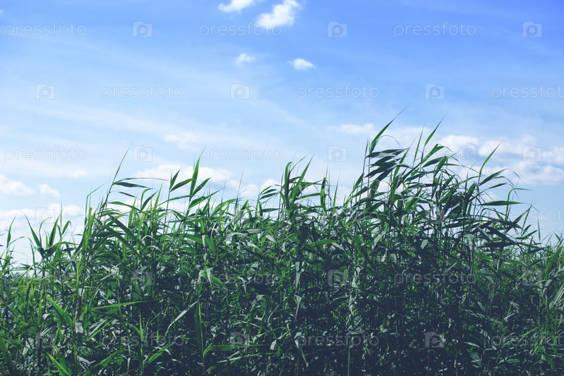 Водяной тростник на фоне голубого ясного неба в летний день